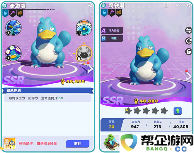 帕萌升级可以提升各项属性,同时升星也可以让帕萌解锁更多技能,提高技能等级的上线。